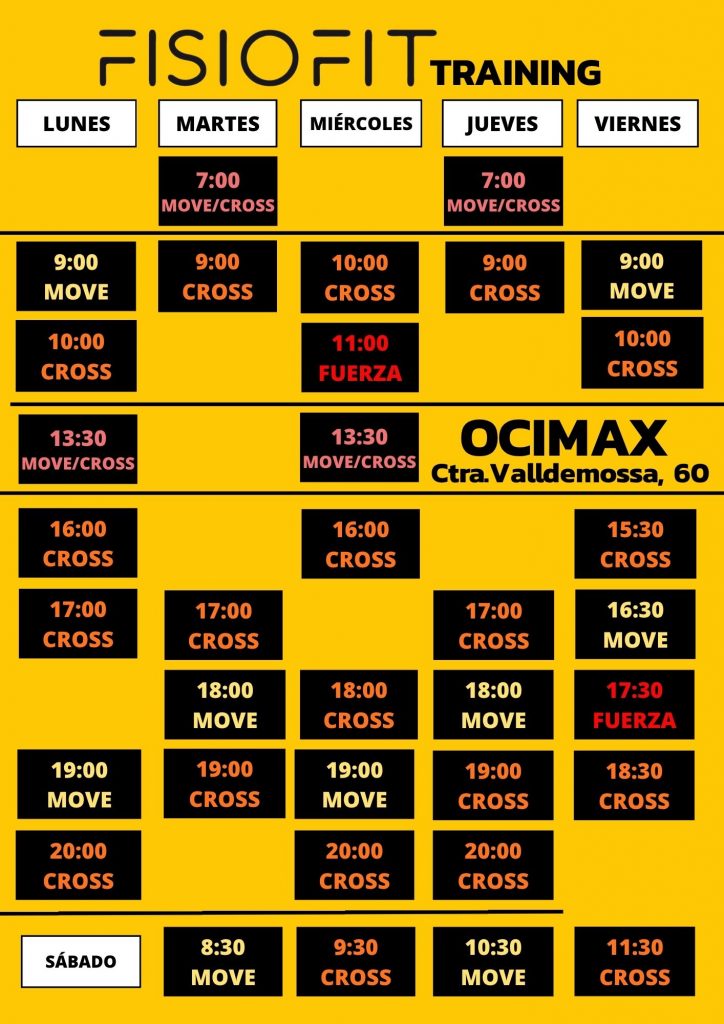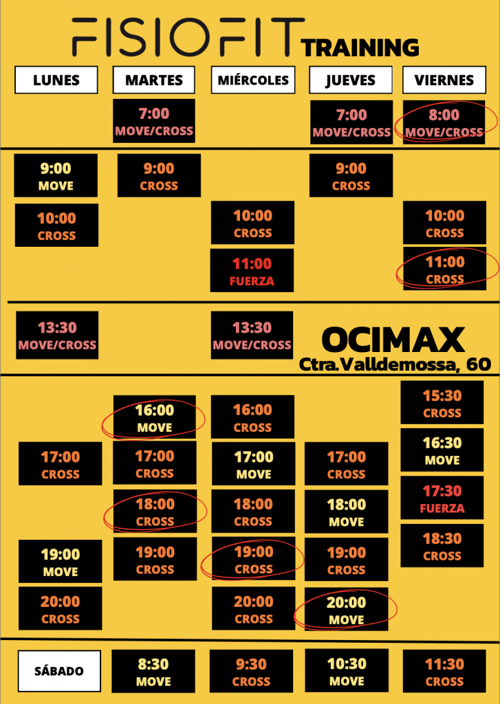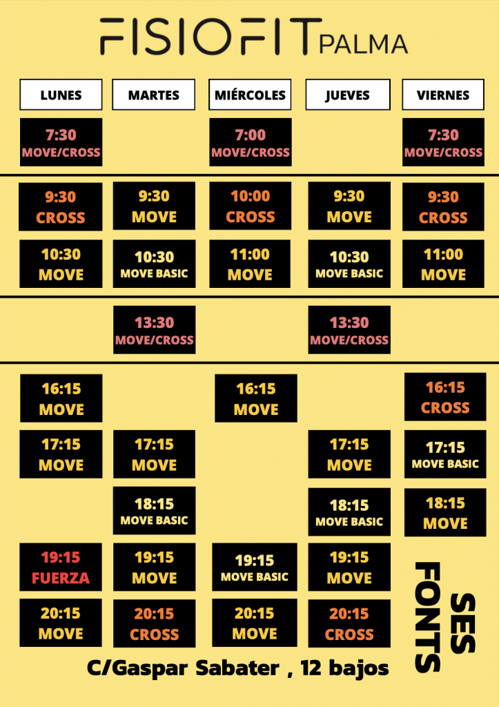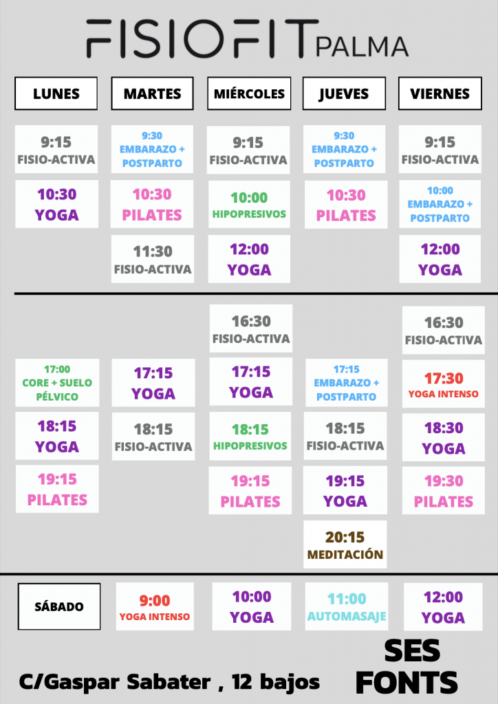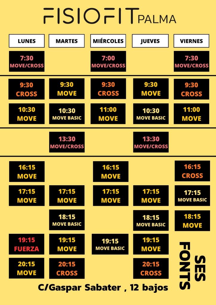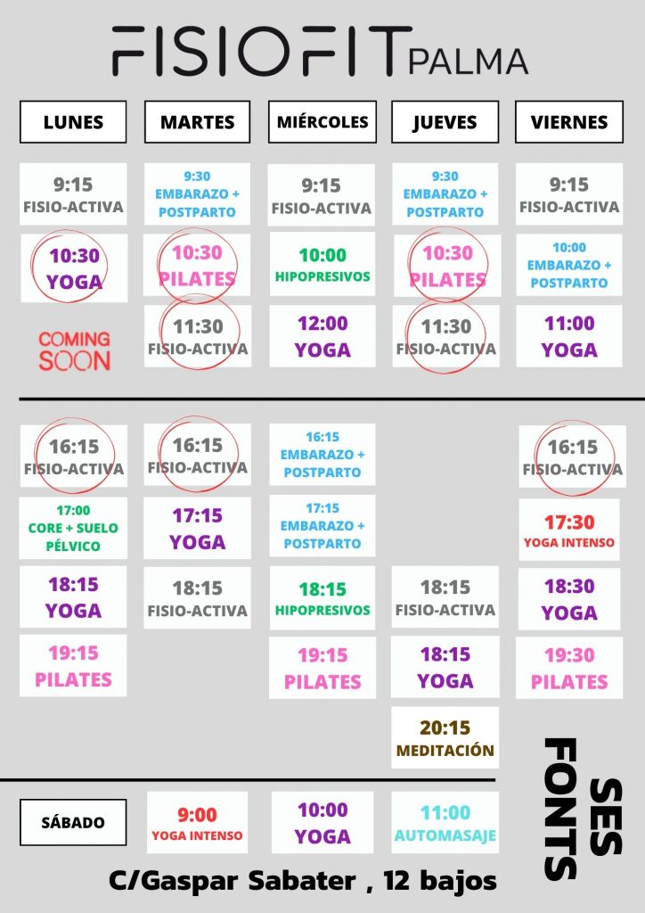 En FisioFit Palma ofrecemos una amplia variedad de clases para todos los niveles, edades y necesidades. Ya seas una persona deportista que busca mejorar su rendimiento o estés en una etapa especial como el embarazo o el posparto, tenemos opciones para ti. Consulta a continuación el horario semanal de nuestras actividades dirigidas: